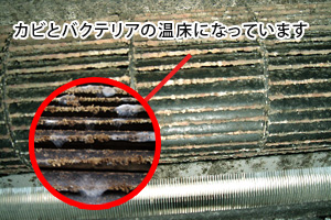 エアコンの内部は外からは見えませんが、徐々に汚れが付着し冷却コイルやファンに体積して、冷却効果を悪化させます。