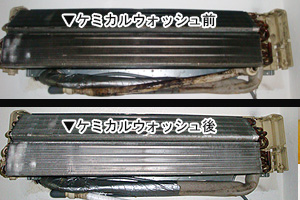 がんこな汚れも専門的な薬品による洗浄(ケミカルウォッシュ)できれいに落ちます。また、クリーニング後は、熱交換の効率や風量も良くなりますので、「省エネ」にもなります。